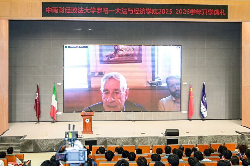 9月25日,中南财经政法大学罗马一大法与经济学院(以下简称法与经济学院)2025-2026学年开学典礼在南湖校区双创楼报告厅顺利举行。法与经济学院党委书记周俊杰、院长李俊、副院长黄赛男,刑事司法学院副院长周凌,法与经济学院意方院长、联合管理委员会副主席、罗马第一大学法学院院长奥利维耶罗·迪利贝托教授,罗马一大教授、中南财经政法大学文澜讲座教授、联合管理委员会委员法布里茨奥·达申佐教授,法与经济学院意方副院长多梅尼科·杜尔西教授,欧洲学项目协调人安杰洛·卡斯达尔多教授、数字经济与法治项目协调人弗朗西斯卡·扬多洛副教授、认知法庭科学项目协调人法比奥·费拉佐教授和人工智能项目协调人亚历桑德罗·梅教授等参加开学典礼,典礼由周俊杰主持。