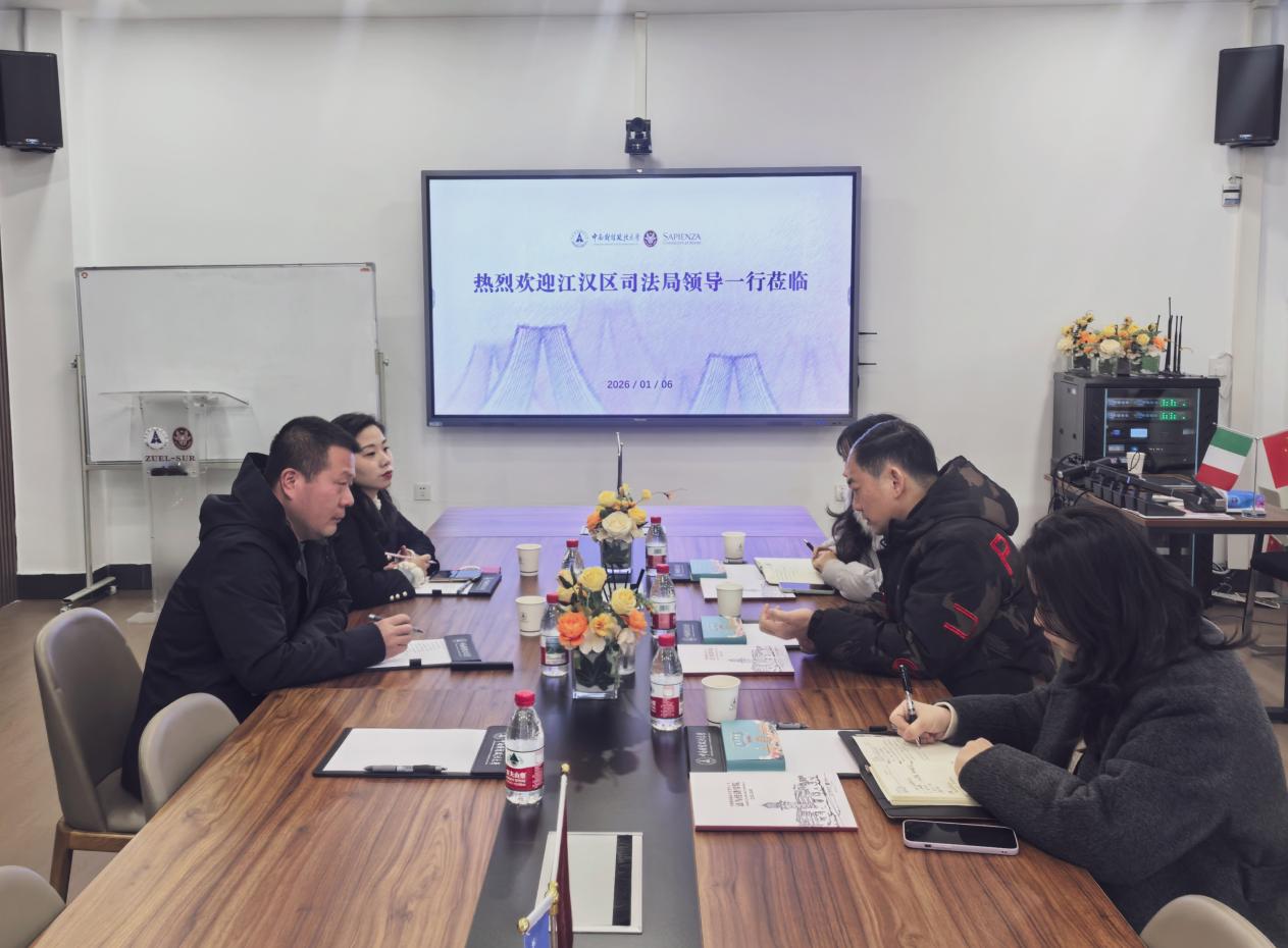 2026年1月6日上午,武汉市江汉区司法局副局长郭华冶一行莅临我院,就深化涉外法律服务合作等事宜进行座谈交流。学院党委书记周俊杰及党政办公室相关负责人参加座谈。